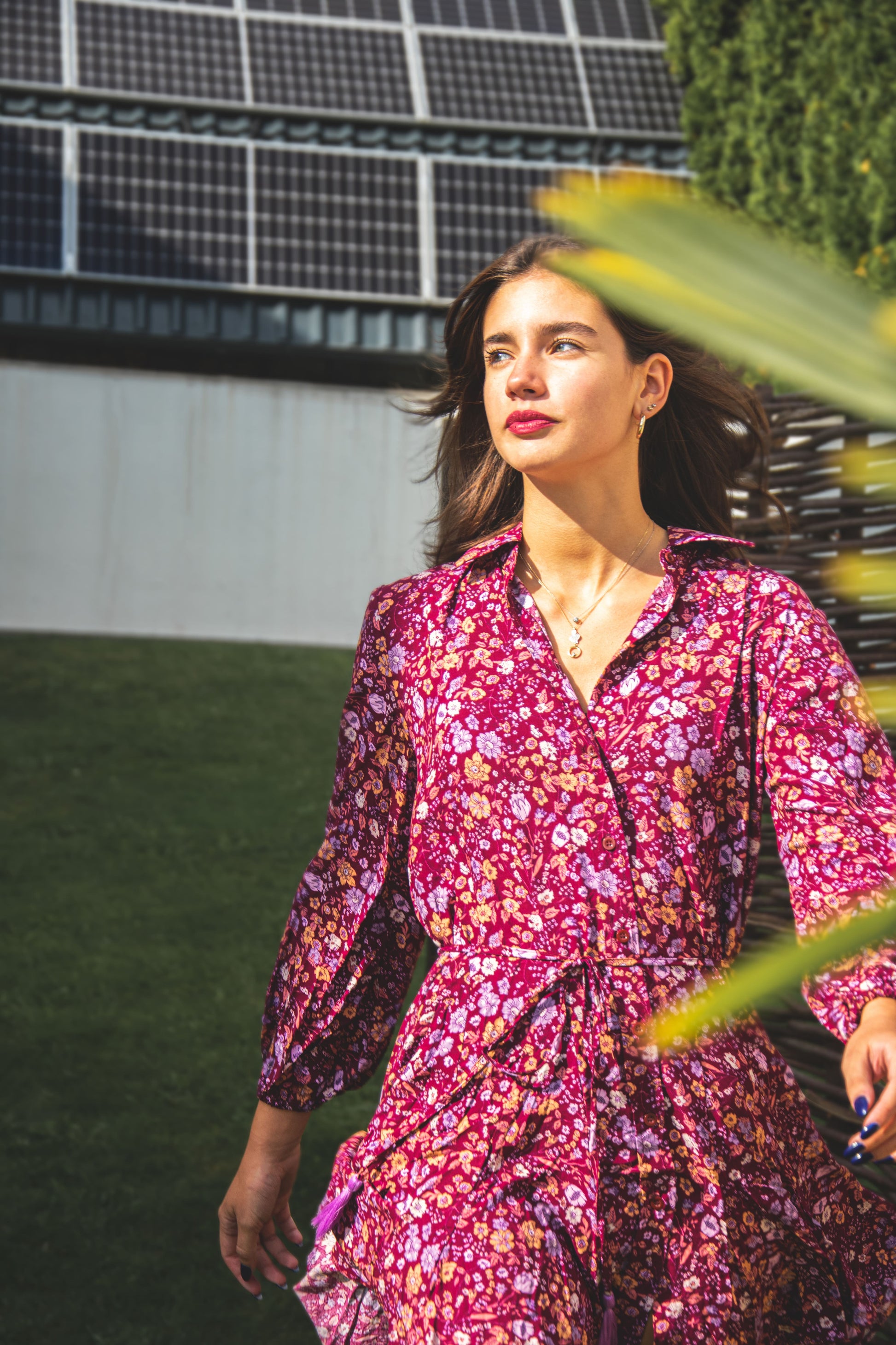 A Velvet Orchid Aina ruha egy légiesen könnyed, elegáns darab, amely a nőiességet és a belső erőt sugározza. A finoman áramló sziluett és a részletgazdag, virágos minta egyedülálló harmóniát teremt. 100% viszkózból készült, amely kellemesen puha esésű, légáteresztő és tökéletes választás minden évszakban. Az állítható derékkötő kiemeli az alakot, míg az enyhén bővülő szoknyarész játékos mozgást ad a ruhának. A hosszú ujjú, gombos fazon elegáns és könnyen variálható – viseld csizmával vagy szandállal, attól függően, hogy épp melyik arcodat szeretnéd megmutatni.