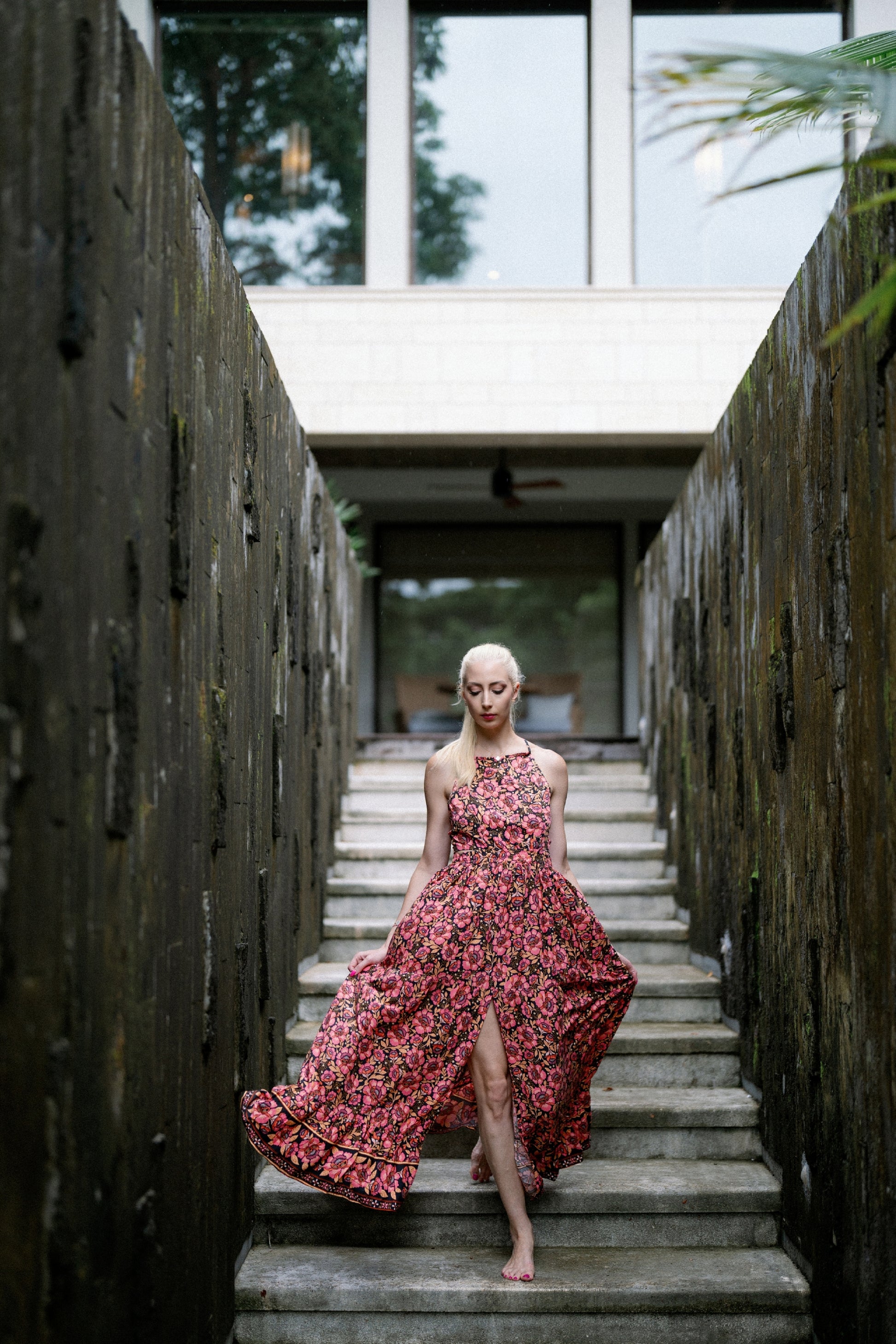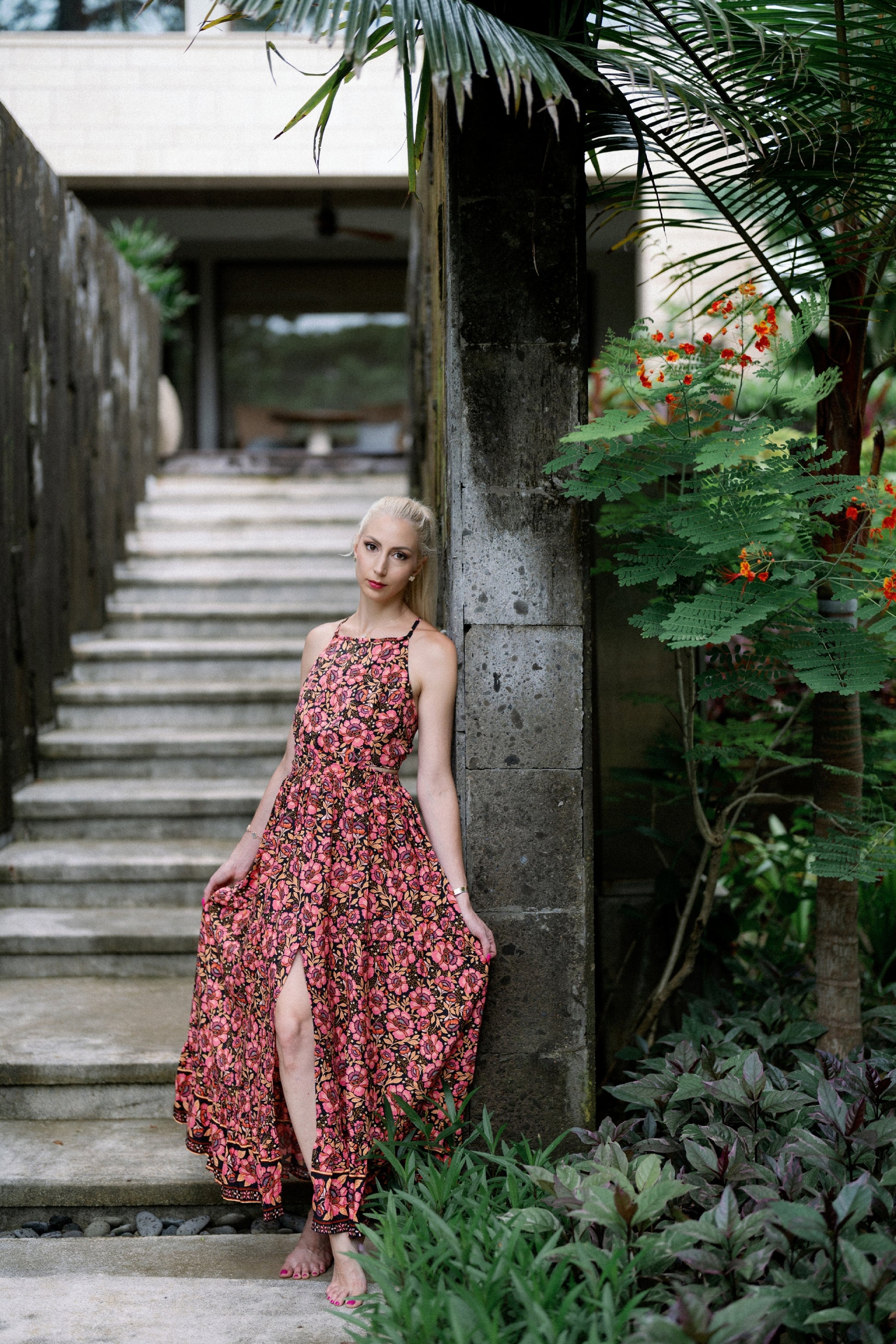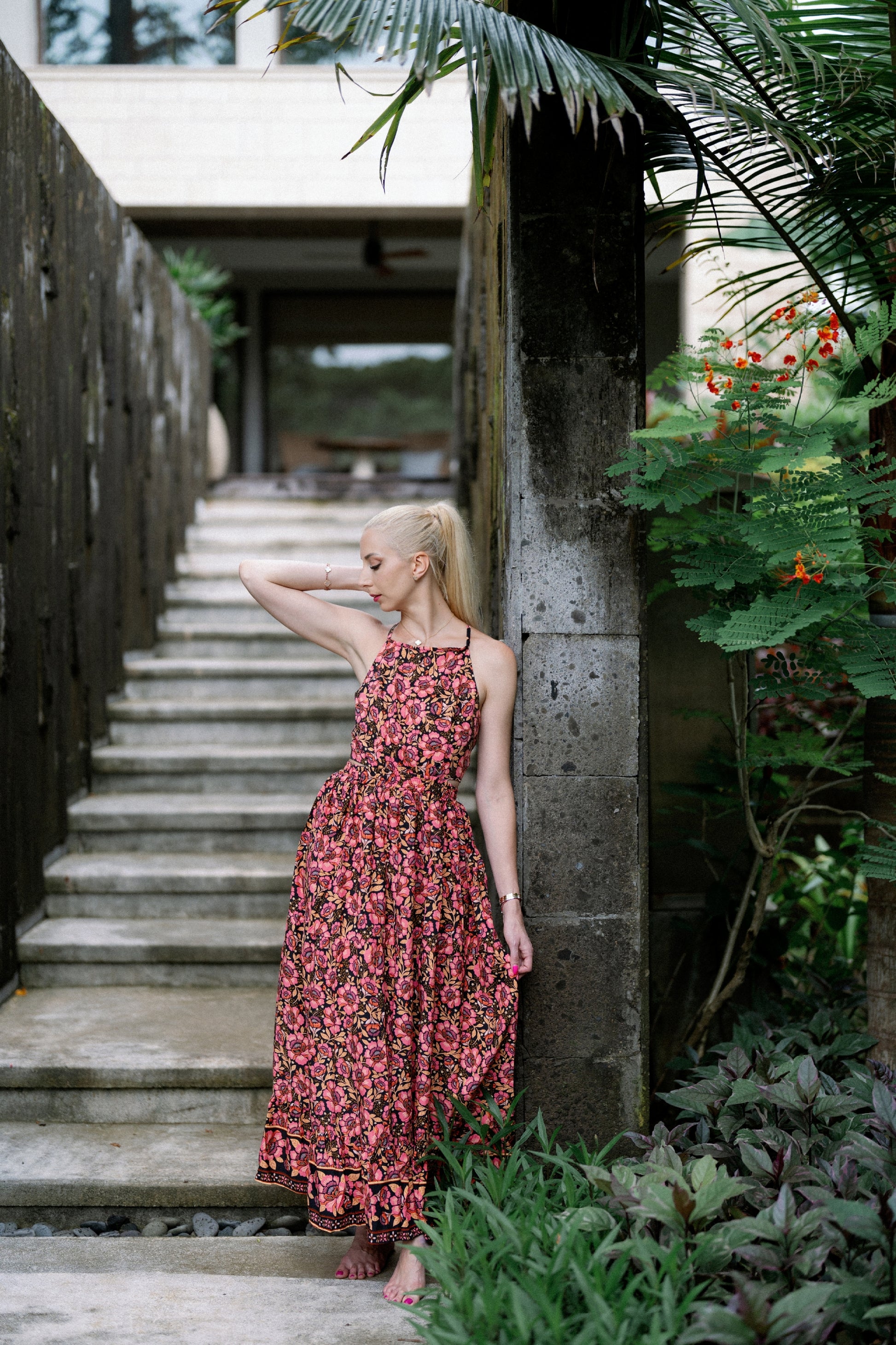 Mélybordó és rózsaszín virágmintája fekete alapon, nyakbakötős és hátnyitott szabása érzékien nőiessé teszi, miközben a karcsúsított fazon és a libbenő szoknyarész elegáns mozgást biztosít. A magas slicc szabad teret ad a lépteidnek, a megjelenés mégis letisztult és harmonikus marad.