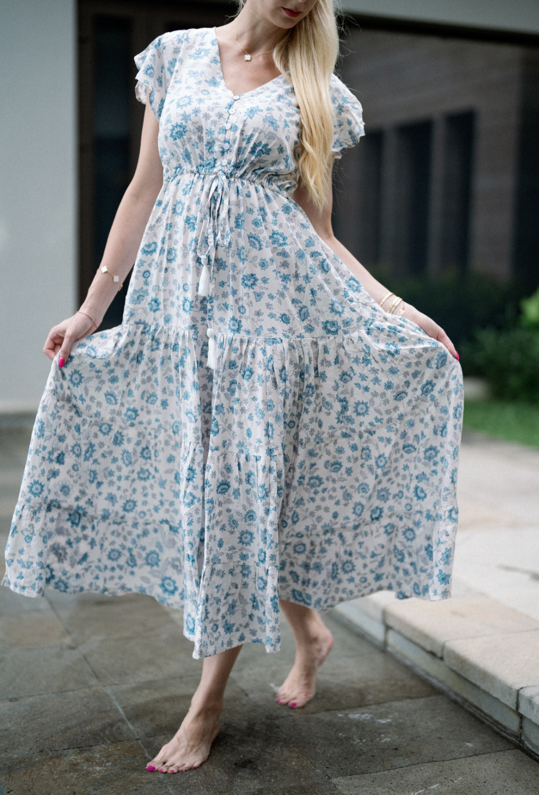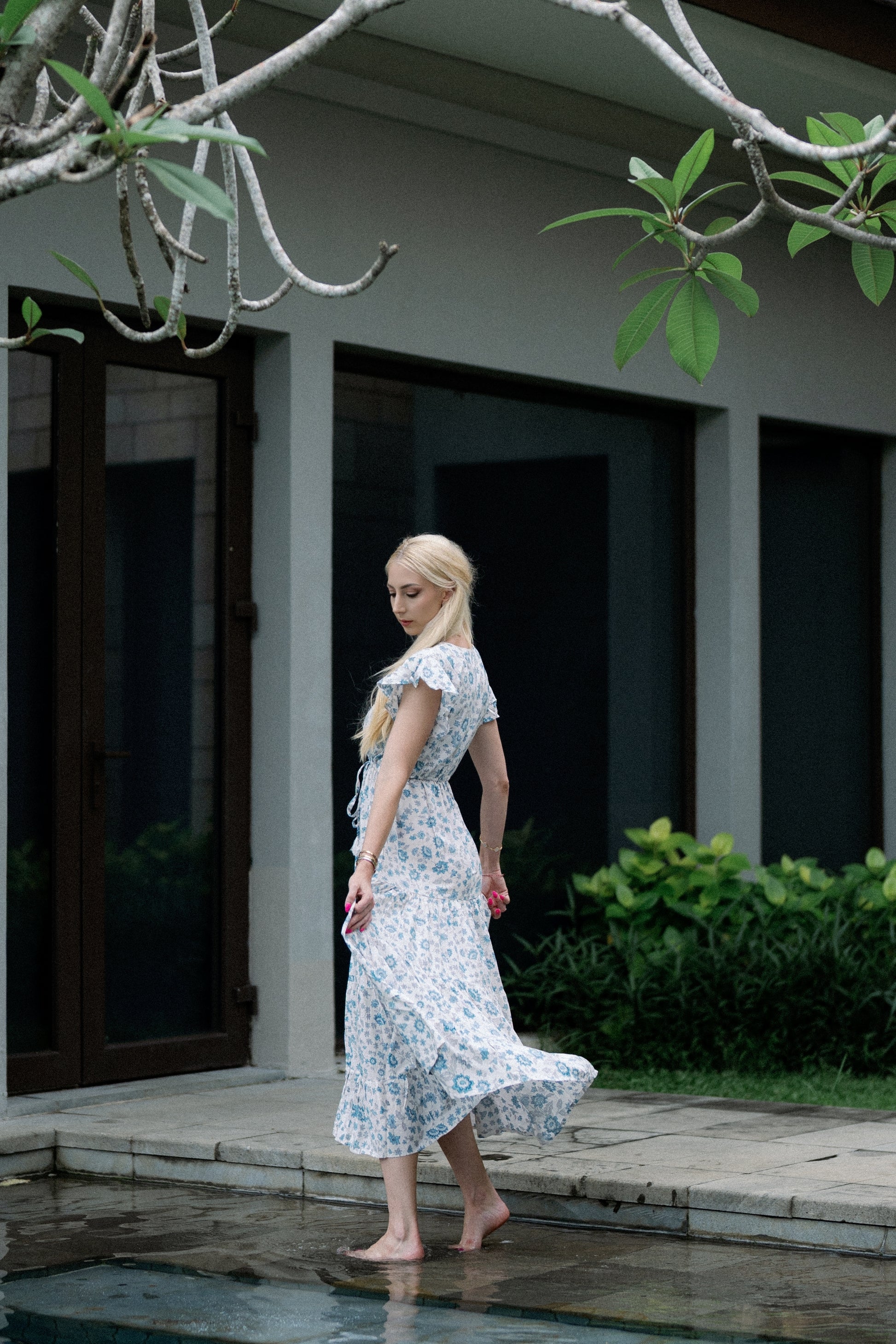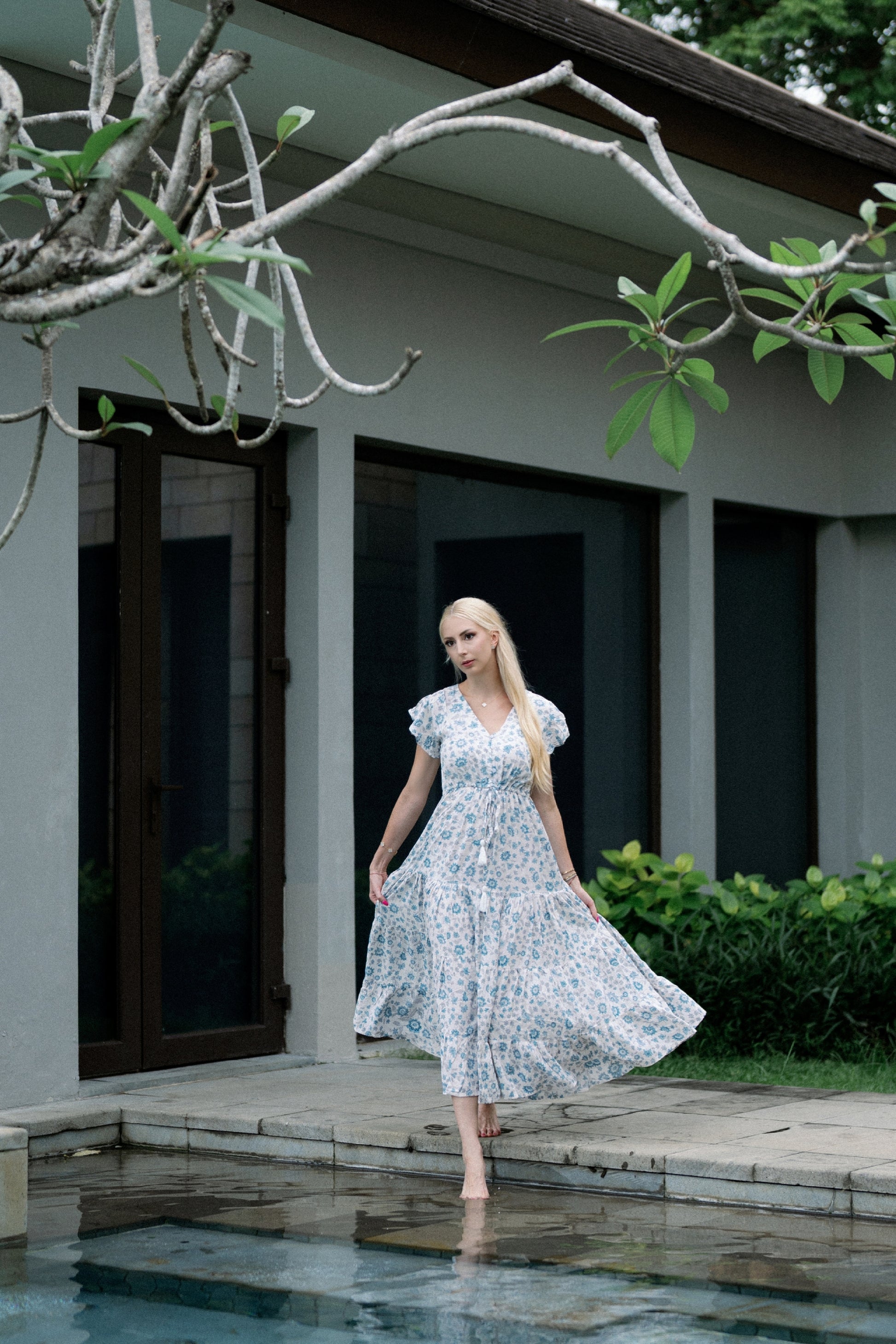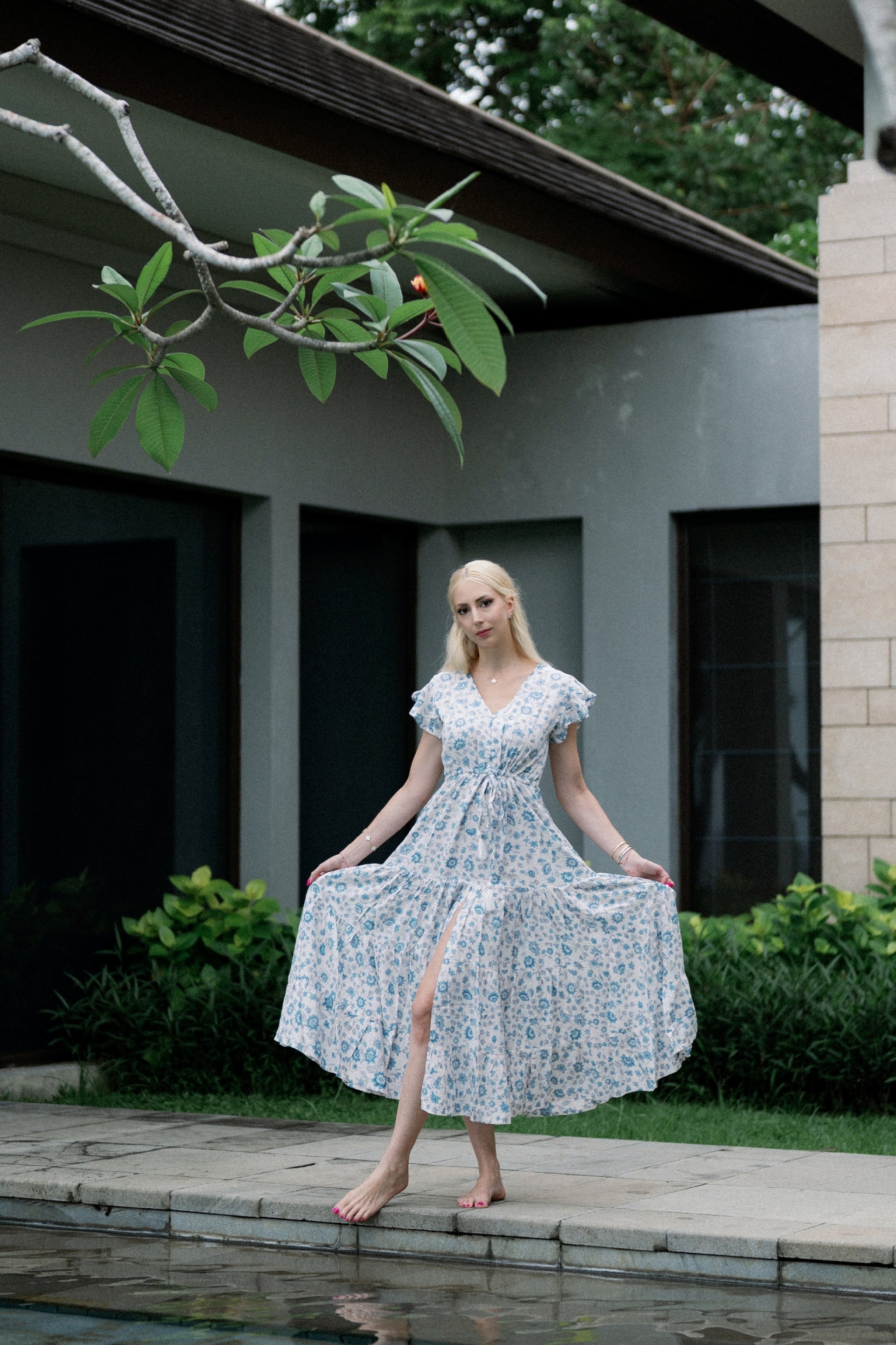 A Blue Serenity árnyalatú Caroline ruha a tisztaság és az emelkedett nőiesség megtestesítője. A finom, halványkék és fehér virágminták, a könnyed, V-alakú dekoltázs, az enyhén fodrozódó ujjrész és az alakkövető szabás kifinomult, mégis természetes megjelenést ad. A ruha légies esése, a lágyan megkötött derékrész és a lebegő szoknya finoman követi a mozdulatokat, mint egy csendes ima vagy egy belső áhítat.